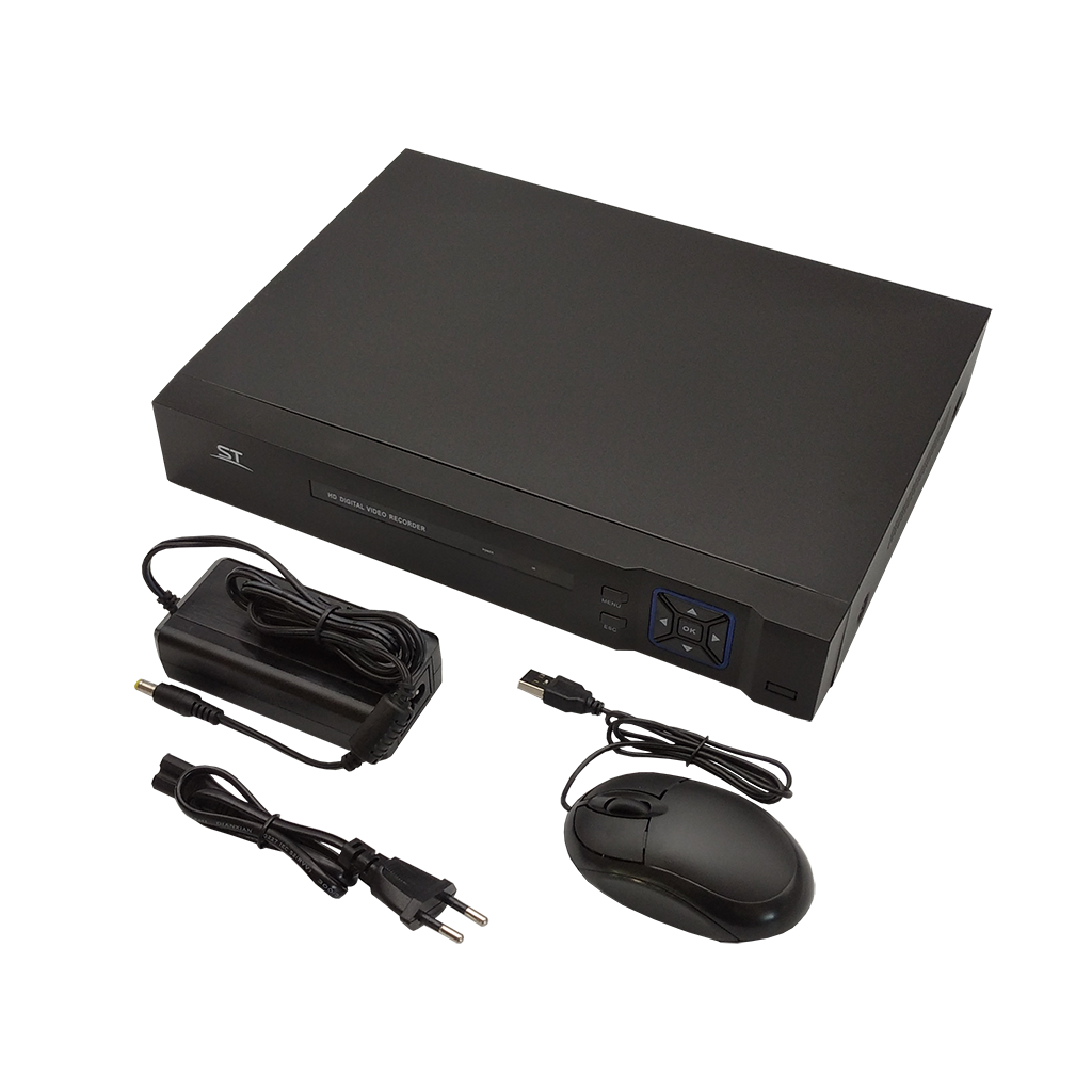 Комплектность Источник питания ~220/12 Вольт с кабелем и вилкой, мышь со скролом и кабелем подключения к USB разъему для управления регистратором, винты крепления HDD к регистратору, стикер бумажный самоклеящийся предупреждение «Ведется видеонаблюдение», паспорт регистратора, тарная упаковка
